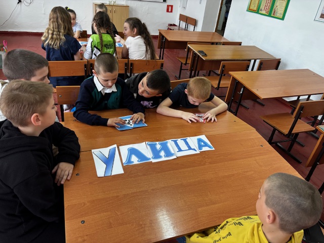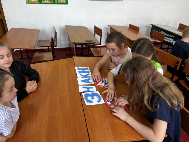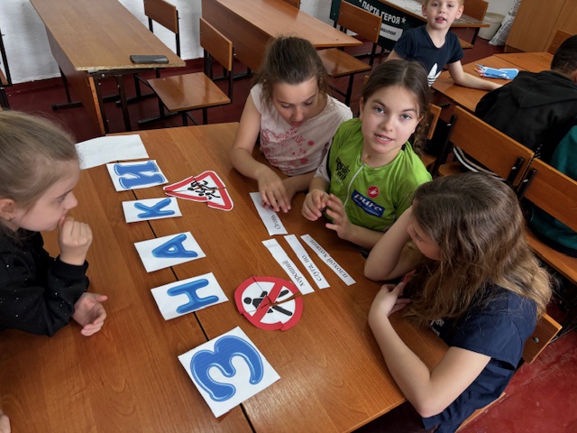 Учащиеся разделились на две команды, составили из букв названия. Затем отгадывали загадки, собирали разрезанные на части дорожные знаки, с закрытыми глазами на листах ватмана рисовали светофор.